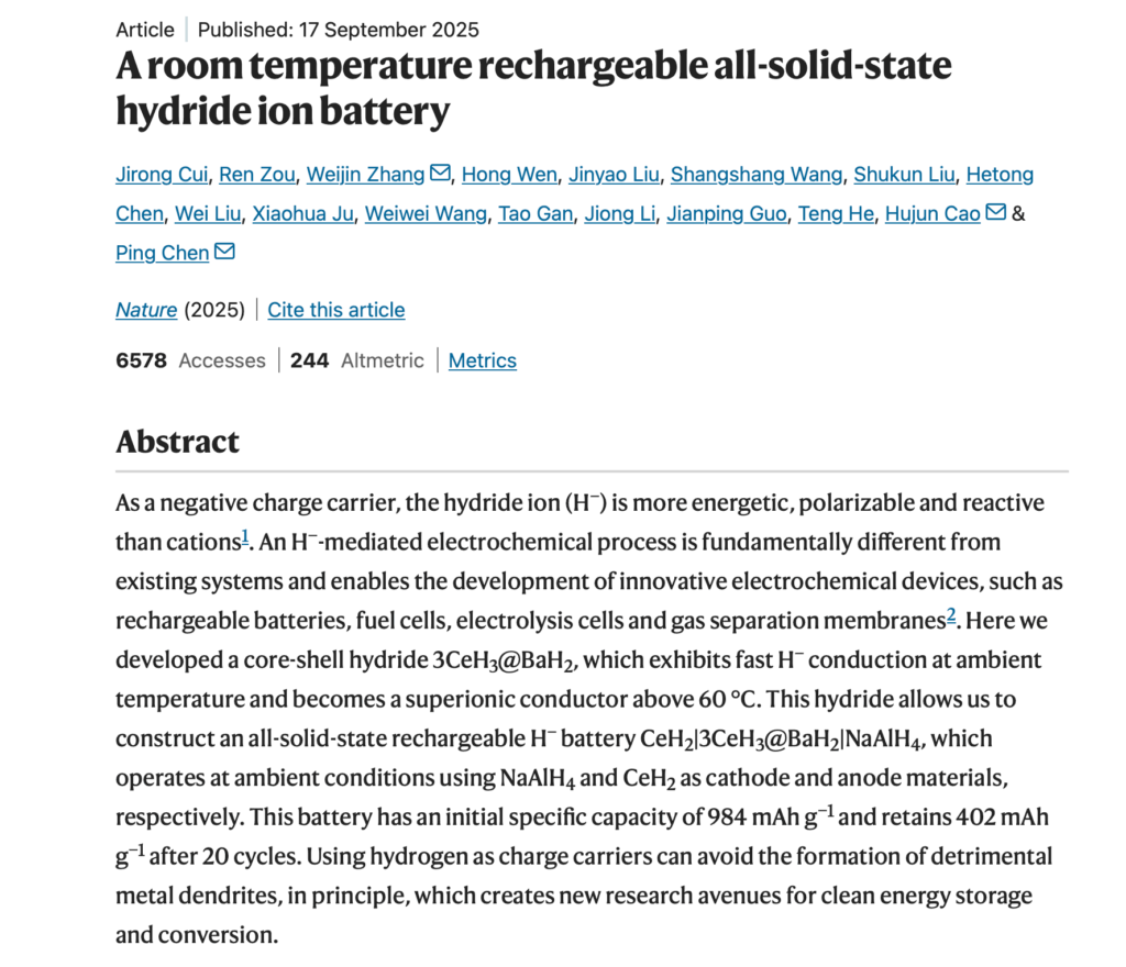 Chinese scientists have achieved a milestone in energy storage: after seven years of intensive research, a team at the Dalian Institute of Chemical Physics, Chinese Academy of Sciences has built the world’s first working prototype hydride‑ion battery (i.e. a hydrogen negative‑ion battery). Their findings, detailing a novel electrolyte and full cell demonstration, were published in Nature on 17 September.